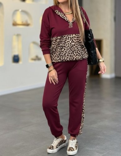 • Kadın uzun kollu kapşonlu leopar desen detaylı viskon iki iplik bluz ve pantolon ikili takım
