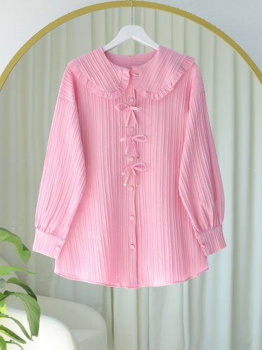 • Önü Kurdele Detaylı Düğmeli Önlük Yaka Gömlek Pembe