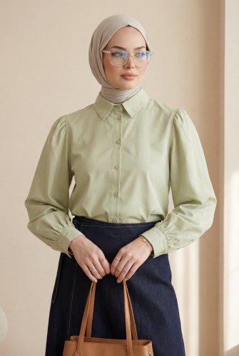• Balon Kol Düğmeli Kısa Poplin Gömlek Zeytin
