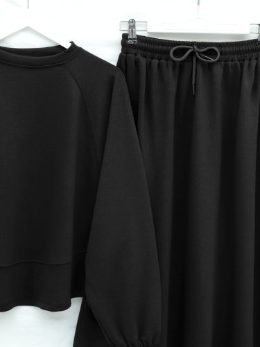 • Yuvarlak Yaka Yarasa Kol Beli Lastikli Etekli Oyşo Takım Siyah