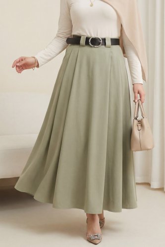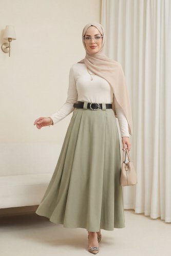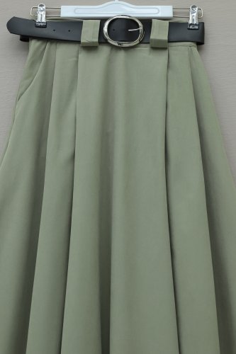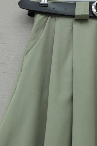 Kalın Kemerli Önü Pileli Yan Cepli Fermuarlı Tivil Etek Haki