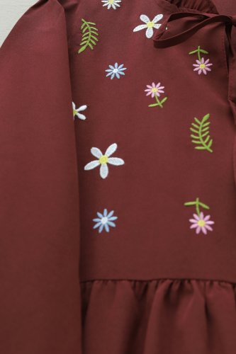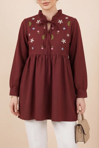 • V Yaka Bağlamalı Yakası Fırfırlı Çiçek Nakışlı Poplin Tunik Bordo