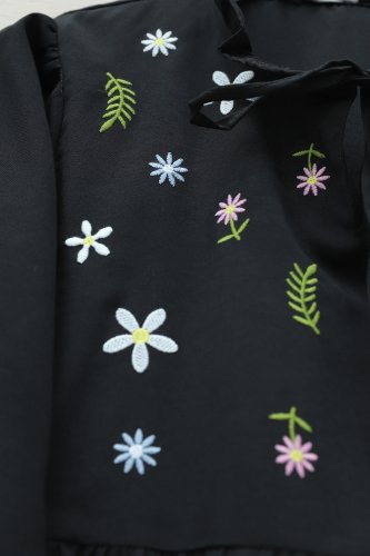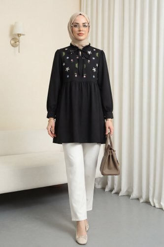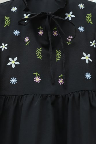 • V Yaka Bağlamalı Yakası Fırfırlı Çiçek Nakışlı Poplin Tunik Siyah