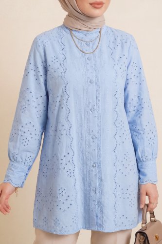 • Yakası Ve Kolu Dantelli Top Düğmeli Astarlı Gömlek Mavi